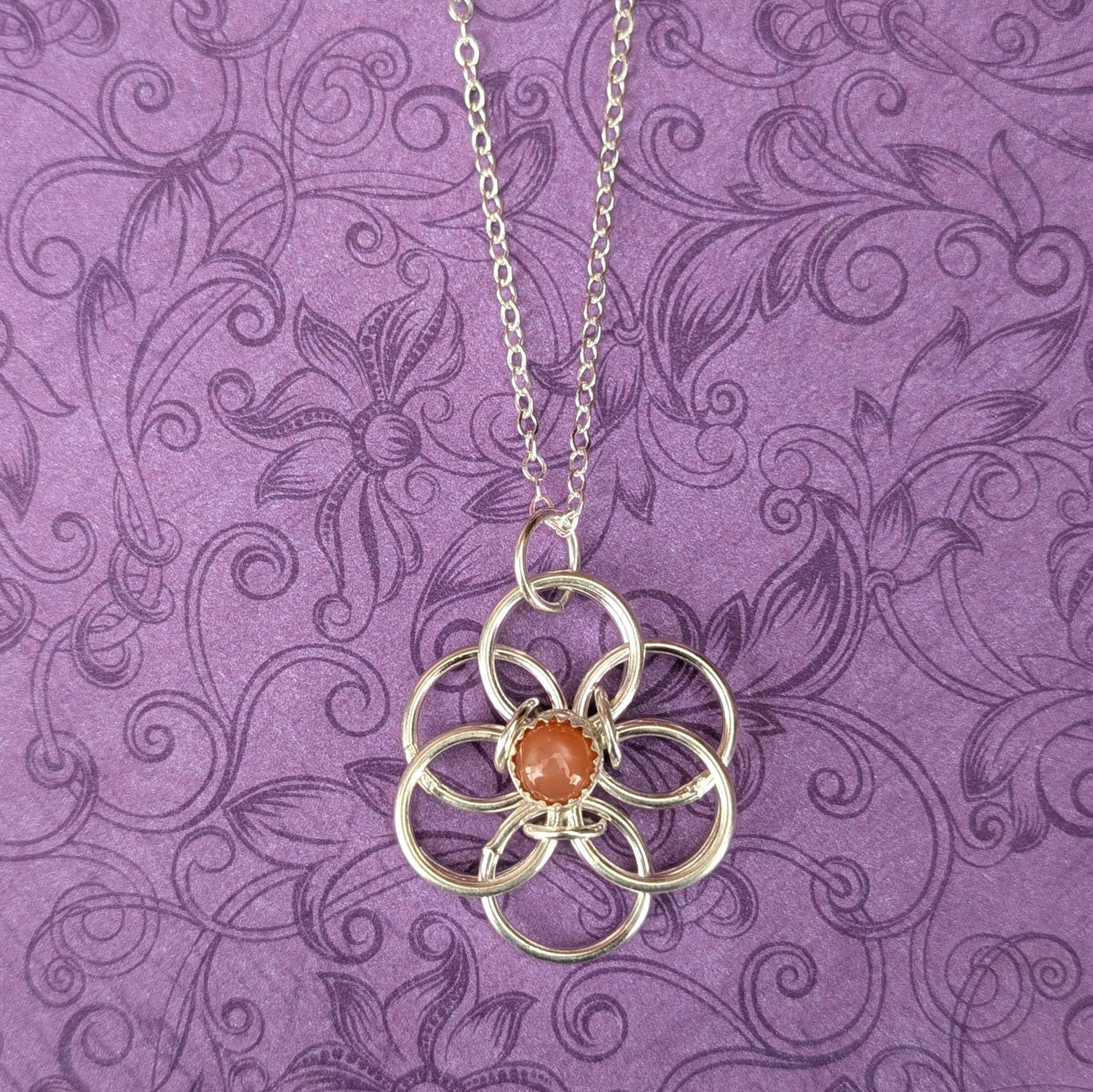 Elegant and timelessly beautiful this handcrafted Sterling Silver and Red Moonstone pendant was handcrafted using chainmail techniques so the rings move, giving this piece the double benefit of being a fidget pendant!